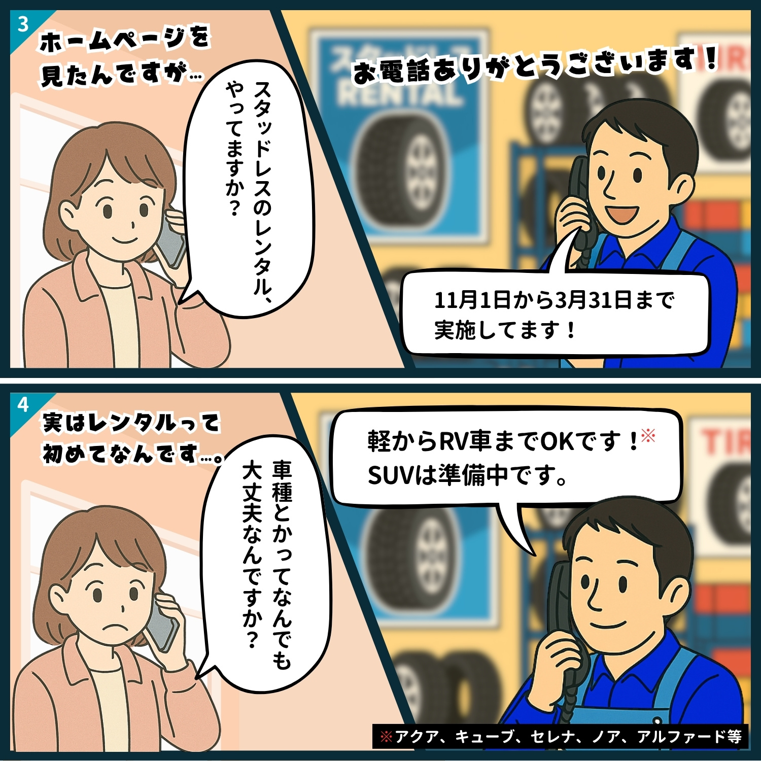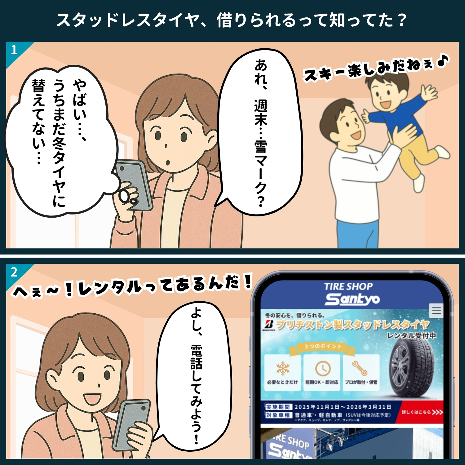 当店では、冬季限定でスタッドレスタイヤの短期レンタルを実施しています。